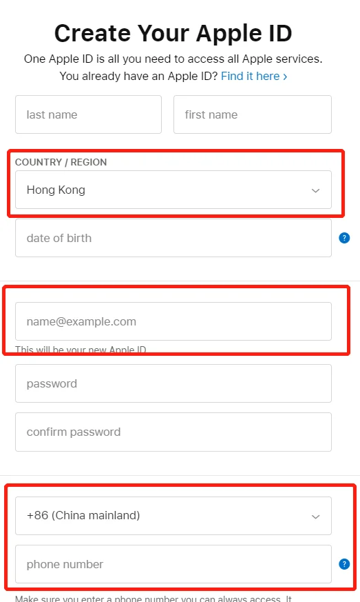 Enter your personal information according to the field. Select "Hong Kong" in the Country/Region. In addition: Email: You need a new email address that has never been registered with an Apple ID to receive the verification code. Mobile number: Support mobile number verification for Mainland China.